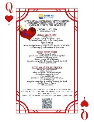 https://aktickets.com/events/10th-annual-fairbanks-funny-festival-celebrity-comedy-roast-of-lisa-sundborg-1-23-2026?fbclid=IwY2xjawPONw9leHRuA2FlbQIxMABicmlkETFwWmdsSUFSZU9QZ1VwUjBmc3J0YwZhcHBfaWQQMjIyMDM5MTc4ODIwMDg5MgABHiSNklKIygzw6T7BbjOErg5NK45DjfGR4yKOlWFIVRL40p9WU9mYYslLAPMc_aem_Iv4AZN_iUmcbjPrjVl8vewContact Information