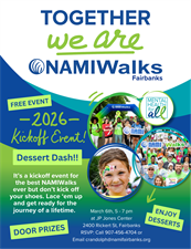 Please join us at the NAMIWalks Fairbanks 2026 Kickoff Event! It's a kickoff event for the best NAMIWalks ever but don't kick off your shoes. Lace 'em up and get ready for the journey of a lifetime. Come and enjoy desserts, door prizes and more.