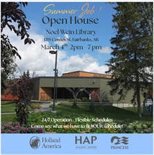 Holland America and Princess Riverside Lodge is hosting a hiring event at the Noel Wein Library on March 4 from 2pm-7pm. This is a 24/7 Operation with Flexible Schedules. Come see what we have to fit YOUR schedule!