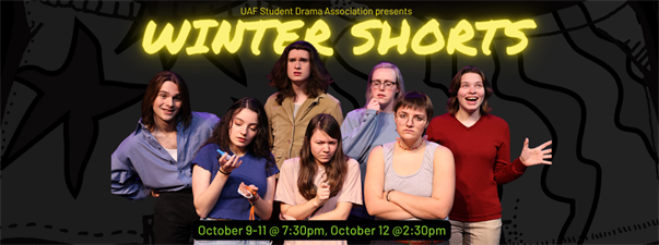 Winter Shorts are a longstanding UAF tradition; the Student Drama Association produces a night of student directed short plays with a student design team, and faculty guidance. The 2025 Winter Shorts lineup includes “100 Love Letters I Never Sent,” written by Adam Szymkowicz and directed by Macy Waarvik, and “Late: A Cowboy Song,” written by Sarah Ruhle and directed by Seamus Knight.